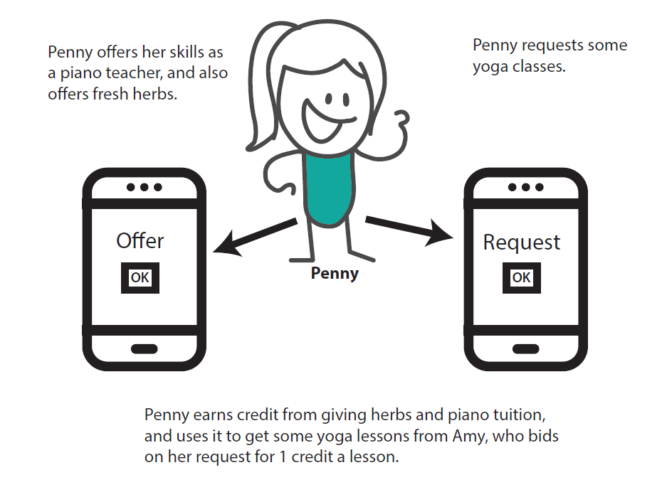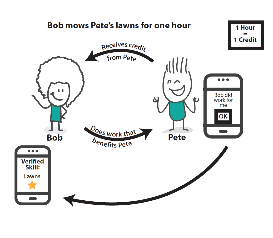 It creates an economy around reciprocal community credit, where value is measured in time, knowledge and skills, instead of money, using a culture of bartering with a standard process.